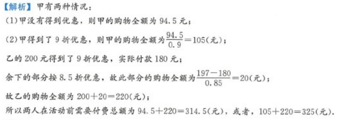某商场在一次活动中规定:一次购物不超过100元时没有优惠;超过100元而没有超过200元时,按该次购物全额9折优惠;超过200元时,其中200元按9折优惠,超过200元的部分按8,5折优惠,若甲、乙两人在该商场购买的物品分别付费94.5元和197元,则两人购买的物品在举办活动前需要的付费总额是( )元