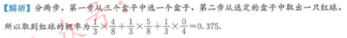 甲盒内有红球4只,黑球2只,白球2只;乙盒内有红球5只,黑球3只;丙盒内有黑球2只,白球2只,从这三只盒子的任意一只中任取出一只球,它是红球的概率是( )